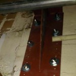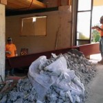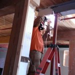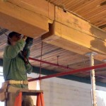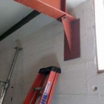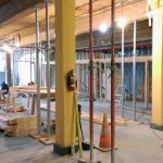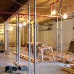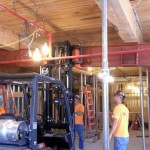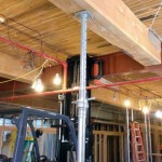 Shoring poles are installed under the giant wood beams. We are installing massive steel beams so that we can get rid of the posts in the Active Room. Nobody wants to run into a great big wood post when they are playing. Ouch!
