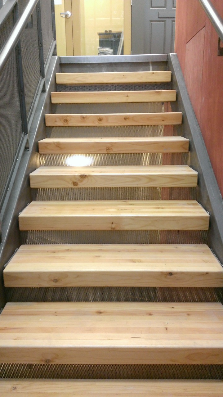The stairwell system is an interesting combination of steel and wood. The lower stairs and landing are made out of wood and the upper stairs are made out of part wood and part steel. The handrails are steel. The stair treads (the part you step on) are made out of pieces of wood beams. The existing building is so solid we figured it deserved something substantial.